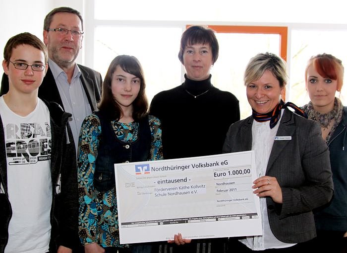 ...die Käthe-Kollwitz-Schule kann sich nun einen langen Wunsch erfüllen. Mit Hilfe der Nordthüringer Volksbank und ihrem Motto "Jeder Mensch hat etwas, das ihn antreibt. Wir machen den Weg frei...", wurde heute ein Scheck über 1.000 Euro überreicht.