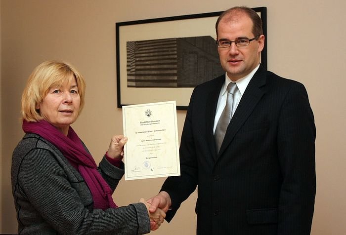 Den bisherigen Amtsinhaber Matthias Jendricke hat heute Oberbürgermeisterin Barbara Rinke mit Wirkung zum 1. Mai erneut zum Bürgermeister der Stadt Nordhausen ernannt. Und die entsprechende Urkunde gab es "gratis" dazu...