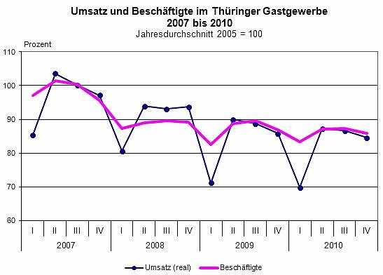 Die Thüringer Gastronomie hatte im Vergleich zum Jahr 2009 einen realen Umsatzrückgang von 1,7 Prozent und einen nominalen Umsatzrückgang von 0,5 Prozent zu verbuchen. Die Zahl der Beschäftigten ging im Jahr 2010 ebenfalls um 1,8 Prozent zurück.