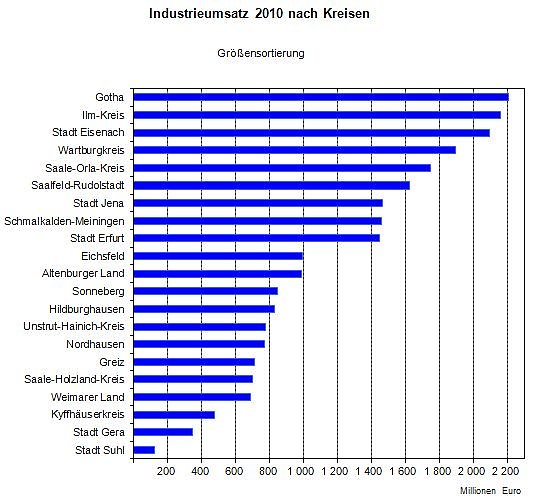 Die Thüringer Industriebetriebe mit 50 und mehr Beschäftigten erzielten im Jahr 2010 einen Umsatz in Höhe von 25,4 Milliarden Euro. Das waren 3,3 Milliarden Euro bzw. 14,8 Prozent mehr als im Jahr zuvor. In allen Landkreisen und kreisfreien Städten Thüringens wurde der Aufschwung sichtbar. Spitzenreiter war nach Mitteilung des Thüringer Landesamtes für Statistik der Landkreis Gotha, gefolgt vom Ilm-Kreis und der kreisfreien Stadt Eisenach.