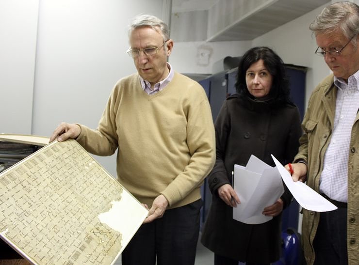 Hans-Jürgen Grönke (links) zeigt Martina Scheitenberger und Rainer Holdefleiß sowie den anderen Mitgliedern der AG die älteste Original-Urkunde der Stadt Nordhausen aus dem Jahr 1158. Kaiser Friedrich überlässt darin dem Nonnenstift zu Nordhausen Burg- und Wirtschaftshof mit Zubehör für jährlich 2 Pfund Pfennige