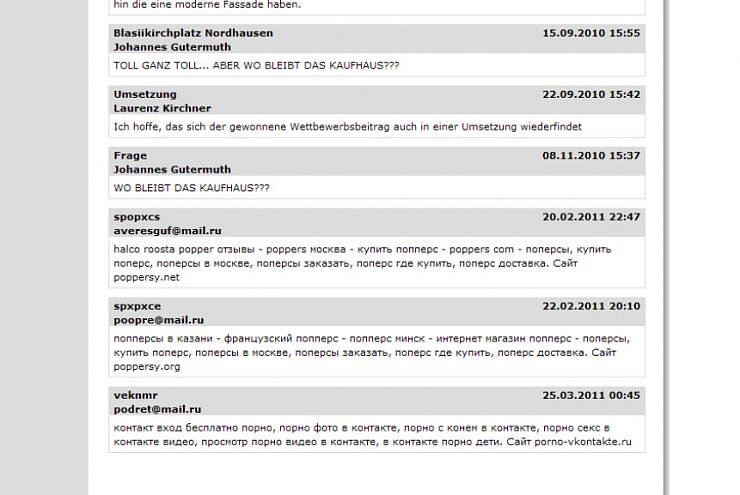 Autor: nnzAls aufmerksamer Bürger verfolge ich seit längerer Zeit die Einträge bzw. Kommentare im Bürgerforum auf der städtischen Webseite zum Projekt Blasii-Kirchplatz. Mit Erschrecken musste ich kürzlich feststellen, dass in russischer Sprache verfasste Kurzverweise auf schlimmste Pornos zu finden sind.