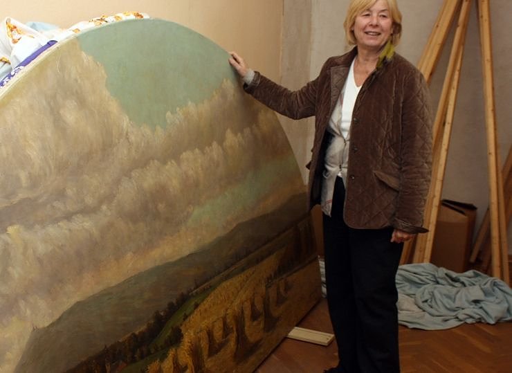 Frau Rinke vor einem der Bilder der Künstlerin Schmidt-Franken. Die Bilder werden in einem städtischen Depot gelagert.