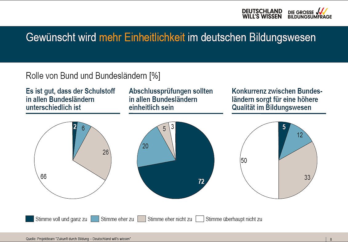 92 Prozent sprechen sich für einheitliche Abschlussprüfungen in ganz Deutschland aus. Die Konkurrenz zwischen den Bundesländern wird als nicht förderlich für eine höhere Qualität des Bildungssystems angesehen. Die Kritik am Bildungsföderalismus wird von fast allen Teilnehmern der Befragung geteilt, unabhängig von Alter oder Bildung.