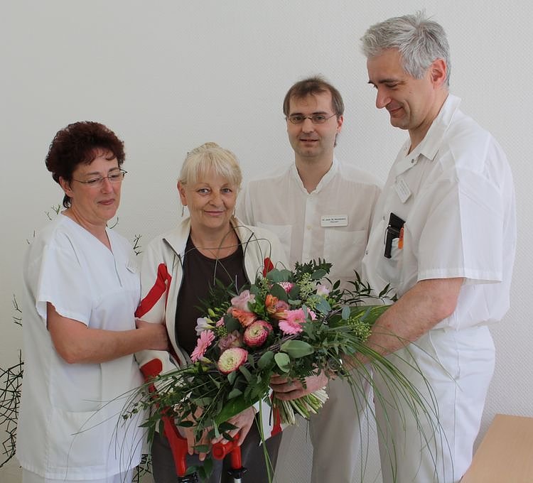 Autor: nnzÜber einen Blumenstrauß aus den Händen von Dr. med. Steffen Kohler, Leiter des Gelenkzentrums in der HELIOS Klinik Bleicherode, konnte sich heute Frau Margitta Zwanzig freuen. Frau Zwanzig ist die 3000. Patientin, die seit Einführung der navigierten Hüftgelenksoperation in der HELIOS Klinik Bleicherode im Jahr 2002 eine künstliche Hüftgelenksprothese erhalten hat.