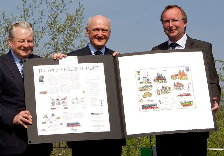 HSB-Geschäftsführer Matthias Wagener überreichte im Rahmen der offiziellen Feierlichkeiten eine Farbradierung des Frankfurter Künstlers Leslie G. Hunt mit Motiven der HSB und des Harzes an Lord Dafydd Elis-Thomas, den Präsidenten der Walisischen Nationalversammlung sowie an Dr. John Prideaux, den Vorstandsvorsitzenden der Festiniog Railway Company.
