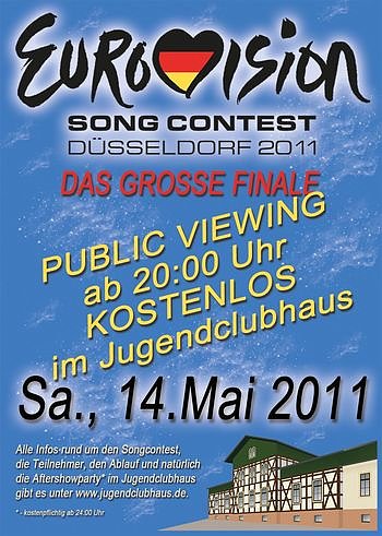 1982 gewann Nicole mit Ein bisschen Frieden den Wettbewerb, und nach 28 Jahren holte die 19 jährige Lena Meyer Landruth im vergangenen Jahr mit ihrem Titel Satellite zum zweiten Mal den Contest nach Deutschland. In diesem Jahr strebt Lena kurz vor ihrem 20.Geburtstag mit Taken By A Stranger die Titelverteidigung an, und in einigen Prognosen rechnet man ihr dabei auch gute Chancen aus. Ob sich der Erfolg noch einmal wiederholt kann zum Eurovision Song Contest – Finale – PUBLIC VIEWING im Jugendclubhaus miterlebt werden. Ab 20:00 Uhr erfolgt der kostenlose Einlass in der Käthe-Kollwitz-Straße. Moderiert von Dirk Daniel werden kompetente Talkgäste erwartet, die, neben reichlich Musik, als warm-up viele interessante Einblicke rund um den ESC geben werden. Pünktlich ab 21:00 Uhr erfolgt die Liveübertragung des Contests auf die gesamte Bühnenrückwand des Hauses.