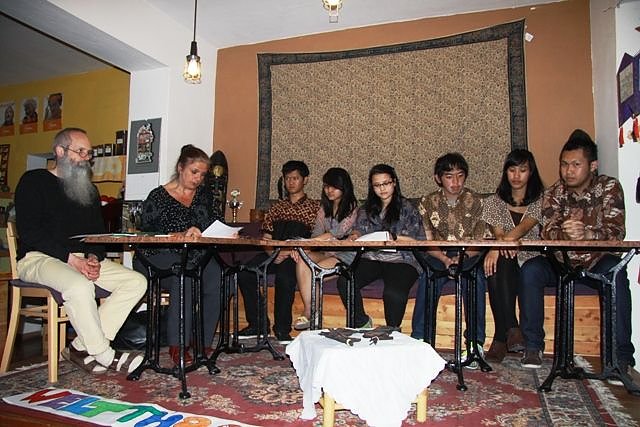 Diese Einladung und seine poetische Umschreibung des Landes aus über 17.000 Inseln setzte sich am Abend fort. Wir hatten uns für Märchen entschieden. Sie wurden von Dramaturgin Anja Eisner für die zweisprachige Lesung konzipiert. Augustina, Dio, Sasmia, Kuat, Egha, Johan und andere Studienkollegiaten aus Indonesien trugen mit ihr und Peter Kube die Märchen vor.