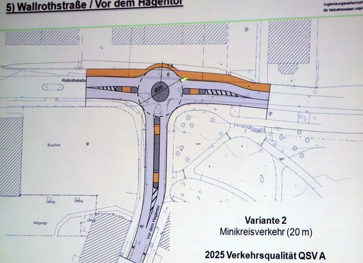 Ein weiterer Kreisel wird von den Planern im Bereich Wallrothstraße/Vor dem Hagentor favorisiert. Entlang des Pferdemarktes soll ein Schutzstreifen für Radfahrer aufgebracht werden. Weiter zum Knotenpunkt Kranichstraße/Engelsburg/Pferdemarkt: Hier ist der Favorit ein 18-Meter-Kreisverkehr, bei dem alle vier Zufahren mit Zebrastreifen versehen werden. Grimmelallee/Grimmel: Hier sollte es eine Vollsignalisierung sein, die dem jetzigen Verkehrsfluss gerecht wird. Seitens des Straßenbauamtes werde an einem Signalisierungskonzept für die Grimmelallee gearbeitet.