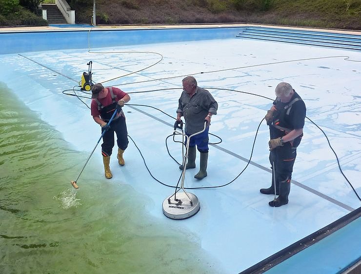 Auch in diesem Jahr werden die anfallenden Arbeiten durch Mitarbeiter des Eigenbetriebes Bauhof durchgeführt. Da der Eröffnungstermin immer näher rückt, muss gegenwärtig auch die aufwändige Säuberung des Schwimmbeckens, der Umlaufrinne, des Schwallwasserbehälters und die Reinigung der Sprungtürme und der Fußbecken vorgenommen werden.