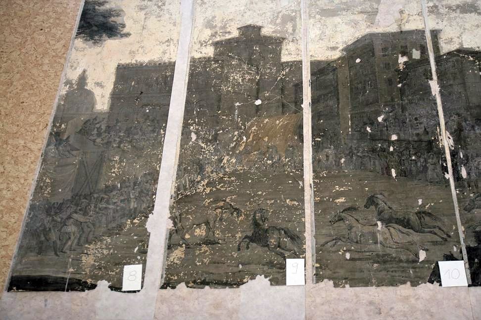 Nachdem die Bahnen von den Saalwänden abgenommen wurden, können sie aufwändig Restauriert werden. Foto: Striezel