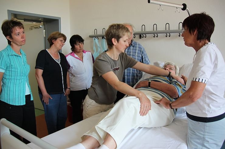 Autor: nnzRuth Wagner spielt die Patientin im Pflegebett, Gabriele Schütze (links) übt unter Anleitung von Medizinpädagogin Marlis Schwerdt, sie zu drehen.