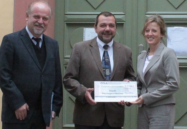 Der Abteilungsdirektor Dr. Dieter Lerch überreichte dem Bürgermeister gemeinsam mit seiner Kundenbetreuerin Sabine Rettich einen Scheck über 1.100 Euro als Gewinnbeteiligung für die geringe Schadensquote im Gebiet der neu gegründeten Stadt Heringen/Helme.