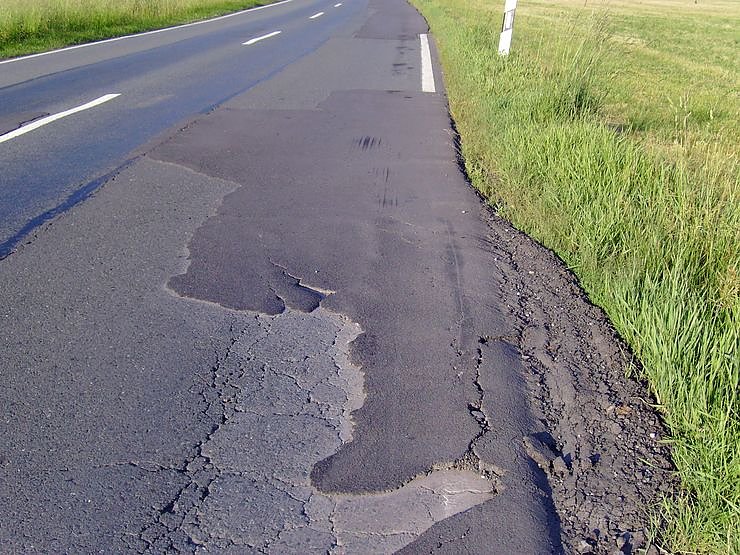 Das Foto zeigt den ruinösen und insbesondere für Zweiradfahrer gefährlichen Zustand der Landesstraße von Niedersachswerfen nach Woffleben, die Unfallbilanz auf dieser Strecke spricht Bände