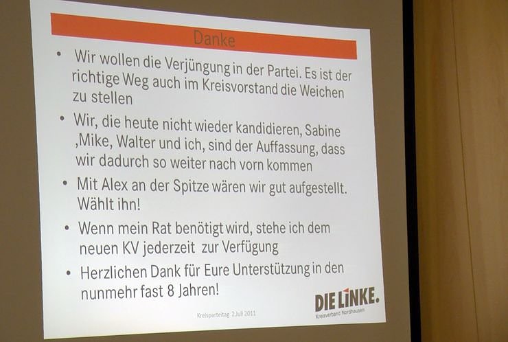 nnz hatte in einem ersten Bericht vom Kreisparteitag der LINKEN über Wahlergebnisse und die Verabschiedung des bisherigen Vorsitzenden, Rainer Bachmann, berichtet. Dessen Verdienste in seiner achtjährigen Tätigkeit von seinem jungen Nachfolger Alexander Scharff vorbehaltlos gewürdigt wurden.