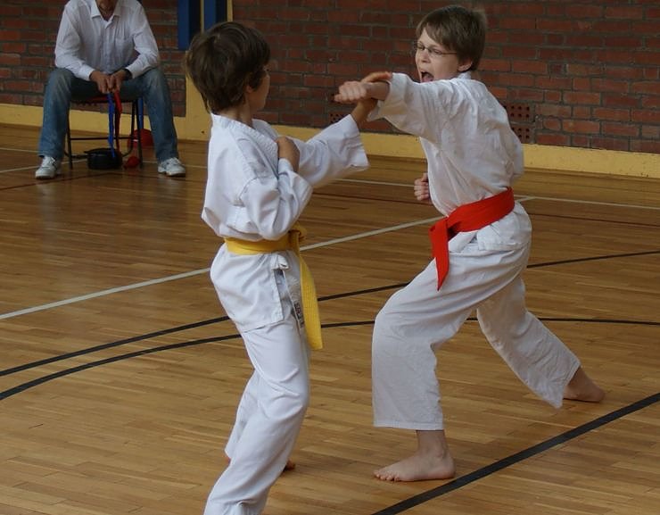 Zuerst startete die Gruppe der Anfänger – 9. Kyu (Weiß- und Weiß-/Gelbgurte). Ihre Aufgaben waren Kata (Formenlauf) und Angriffstechniken auf einen Ball als Ziel. Erste wurde hier Michele Hoang vor Moritz Brehm und Igor Karpov. Dann kamen die Kämpfer und Kämpferinnen mit dem 8. und 7. Kyu (Gelb- und Orangegurte). Sie maßen sich im Kata-Lauf und im abgesprochenen Kumite (Zweikampf). Siegerin wurde Virginia Bode, Zweite Isabel Adam, Dritte, wie auch im letzten Jahr, Lisa Sanftleben. Bei den Jungs setzte sich in dieser Klasse Mathias Zeaiter vor David Malcherek (im Bild links) und Moritz Döring (im Bild oben rechts) durch.