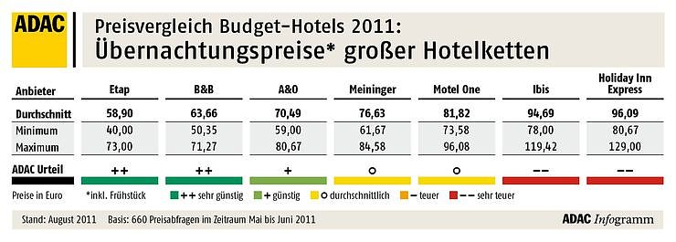 Nach den Ergebnissen des ADAC Vergleichs sind die Chancen, ein günstiges Zimmer zu finden, bei Etap am höchsten. Der Automobilclub ermittelte einen Durchschnittspreis von knapp 59 Euro pro Übernachtung mit Frühstück. B&B lag bei rund 64 Euro. Damit sind beide über ein Drittel billiger als der teuerste Anbieter Holiday Inn Express. Mit stattlichen 96 Euro im Mittel reichte es nur für das ADAC Urteil sehr teuer. Ebenfalls sehr teuer schnitt Ibis mit rund 95 Euro ab. Beide Hotelketten wiesen zudem die größten Preisspannen zwischen ihren Häusern auf: Rund 48 Euro waren es bei Holiday Inn Express, immerhin noch 41 Euro bei Ibis.