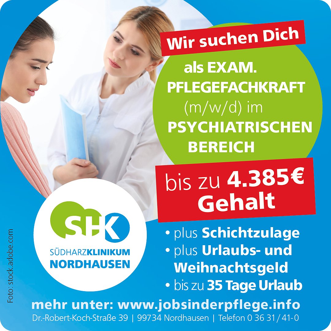 Die Südharz Klinikum Nordhausen gGmbH ist ein Krankenhaus der überregionalen Versorgung mit rund 800 Betten und 26 Fachabteilungen sowie modern ausgestatteten Funktionsbereichen und Instituten. Wir sind Akademisches Lehrkrankenhaus des Universitätsklinikums Jena.Zur Durchführung einer patientenorientierten und ganzheitlichen Pflege unserer Patienten im psychiatrischen Bereich suchen wir einen Pflegefachkraft (m/w/d) in Voll- bzw. Teilzeitbeschäftigung im Teilnahme am Schichtdienst.