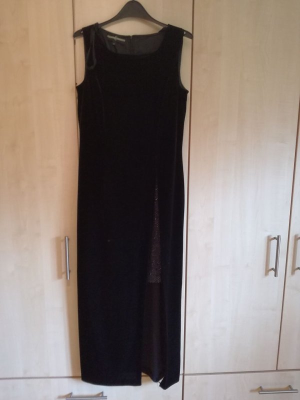 Langes schwarzes Samt-Kleid mit langem Schlitz Größe 36.Kleines Brandfleck vorne auf dem Kleid, kaum sichtbar. Einmal getragen.