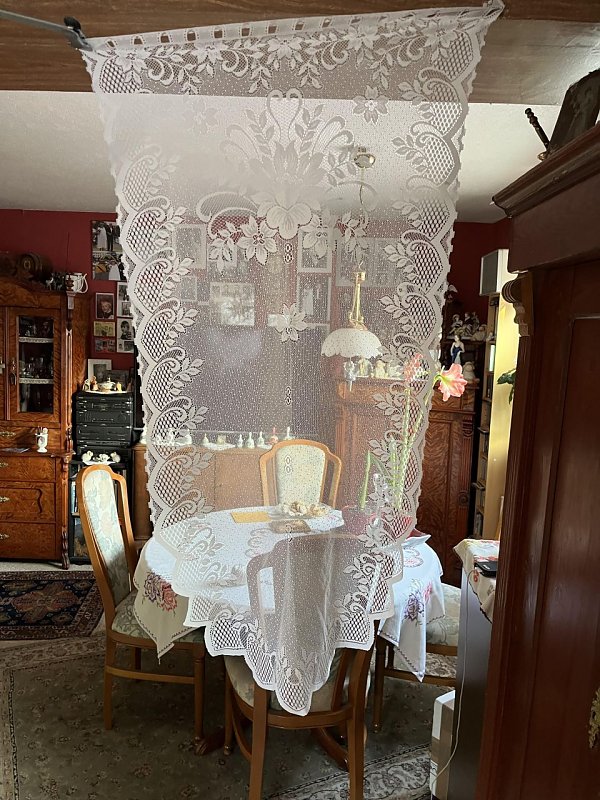 Biete: Scheibengardine für Balkontür gebraucht 64 cm breit und bis zur Spitze ca. 125 cm lang.