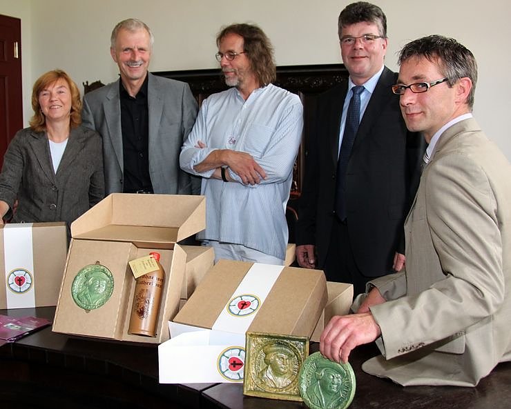 In einem eigens angefertigten Paket ist nicht nur der Luther-Korn in der historisch inspirierten Flasche sicher verpackt. Dort hat auch ein rundes Relief des Reformators Platz, das der einheimische Künstler Lothar Rechtaczek in aufwändiger Handarbeit gestaltet hat. Vorbild für dieses Bildnis von Martin Luther ist eine historische Ofenkachel aus der Renaissancezeit Mitte des 16. Jahrhunderts. Diese Kachel ergab sich aus grünen Scherben, die in den 90er Jahren auf der Burgruine Hohnstein gefunden wurden. Es wird davon ausgegangen, dass die Hohnsteiner Grafen von Stolberg die neue reformatorische Lehre befürworteten. Denn in Stolberg wurde schon 1518 protestantisch gepredigt, so Dr. Sabine Mehne. Deshalb ist es denkbar, dass der Ofen, zu dem die Scherben gehörten, noch zu Lebzeiten Luthers auf der Burg Hohnstein seinen Platz fand.