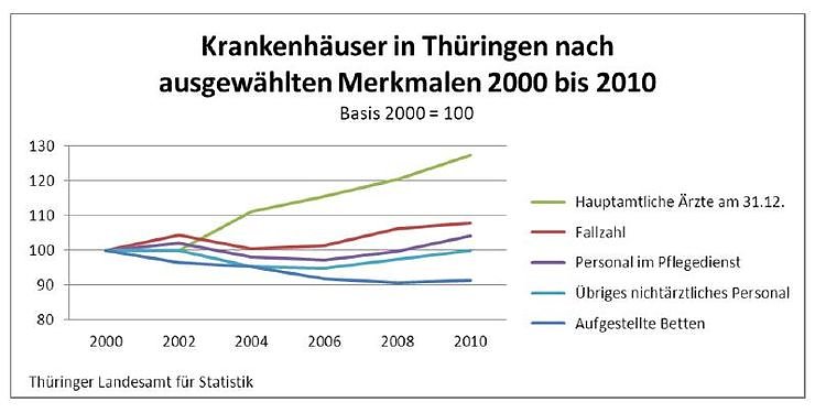Ende 2010 wurden die Patienten in den Thüringer Krankenhäusern von 4 148 hauptamtlichen Ärzten behandelt. Das waren 145 Ärzte bzw. 3,6 Prozent mehr als ein Jahr zuvor. Im Vergleich zum Jahresende 2000 stieg die Zahl der Ärzte um mehr als ein Viertel (27,3 Prozent) an.