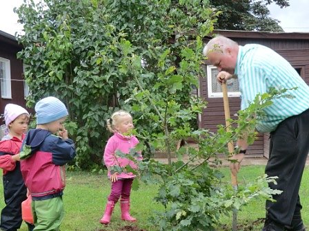 Bildung für nachhaltige Entwicklung" im Kindergarten widmet sich in den drei Kapiteln "Nachhaltigkeit verstehen - vermitteln - gestalten". Ein wichtiger Bestandteil in der Elementarpädagogik ist es den Kindern die Werte der Natur nahezubringen - für eine lebenswerte Umwelt. Unter dem Motto Mit Bäumen umgibt uns ein Stück Natur brachte Opa Karl (Brauer) den Kindern eine Esche, eine Eiche, einen kanadischen Bergahorn, eine Haselnuss, eine Birke und eine Ulme in den Kindergarten. Schnell fanden sie einen Platz in unserem großen Außengelände und wurden gepflanzt. Das angießen und einwässern übernahmen mit viel Freude die kleinen Knirpse.