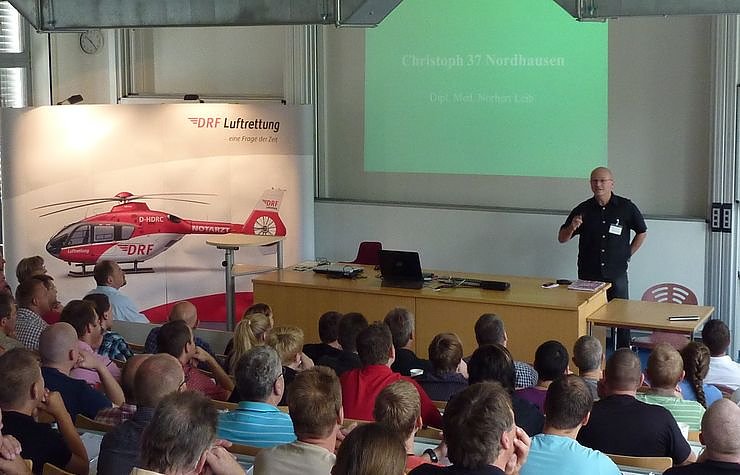 Neben den Besatzungsmitgliedern der Nordhäuser Hubschrauberstation nahmen 110 Mitarbeiter von Rettungsorganisationen und Kliniken aus der Region an dieser Fortbildung teil. Nach einem kurzen Eröffnungsvortrag zu dem in Nordhausen stationierten Rettungshubschrauber der DRF Luftrettung und den Einsatzmöglichkeiten von Christoph 37, schlossen sich fünf Fachbeiträge an, die sich mit der zeitkritischen Versorgung und dem Transport von Notfallpatienten beschäftigen. Dr. Ulrich Erdmann, Chefarzt der Klinik für Neurologie im Südharz- Krankenhaus Nordhausen ging in seinem Beitrag Der neurologische Notfall darauf ein, wie wichtig beispielsweise bei einem Schlaganfallpatienten die schnelle Versorgung am Einsatzort und der Transport in die Klinik ist.