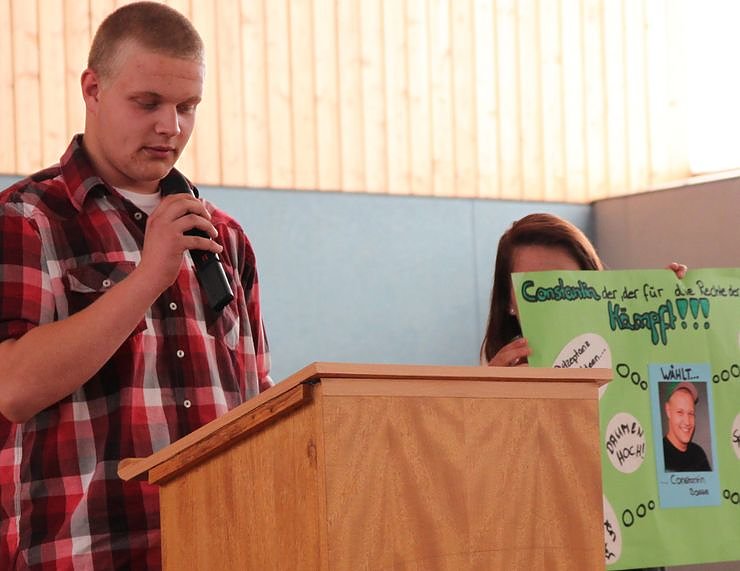 Der Schülersprecher und sein Stellvertreter sollte für die kommenden zwei Schuljahre gewählt werden. Sieben Schüler ab der Klasse 7 kandidierten für das Amt. Mit dem Projekt Wissen wie´s geht! – Demokratie in dein Klassenzimmer bereiteten sich die Sieben in der vergangenen Woche vor: Gemeinsam mit ihrem Wahlkampfteam erarbeiteten die Kandidaten die Formulierung ihrer Wahlziele, einen Wahlkampfslogan und eine Wahlkampf-Rede. Bunte Wahlplakate für jeden Kandidaten wurden im Schulhaus verteilt, sodass sich alle Mitschüler genau über die Kandidaten informieren konnten.