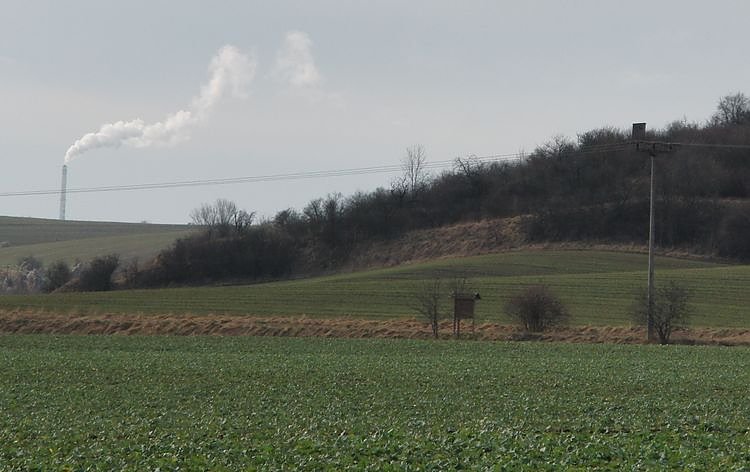 Das Bild zeigt einen rauchenden Begleiter des Südharz-Hunderters, den Schornstein des Romonta-Werkes Amsdorf zwischen Eisleben und Halle. Er wurde schon fast zu einem Markenzeichen der Tour, weil man ihn auf einer Streckenlänge von etwa 40 Kilometern aus den unterschiedlichsten Positionen und Entfernungen sehen kann. Dieses Foto können die Wanderer Ende Oktober schießen, kurz bevor sie den Ort Köllme, den letzten Ort vor Halle, nach 93 km passieren. Es entstand im Februar 2011 auf der Route Halle-Nordhausen.