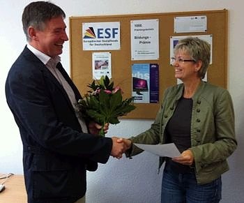 Dazu gab es als kleine Überraschung einen Gutschein für einen weiteren Kursbesuch und einen Blumenstrauß. Mit der Bildungsprämie lassen sich unter bestimmten Voraussetzungen berufliche Weiterbildungen bei einem Bildungsträger nach Wahl fördern. Ute Breuer möchte beispielsweise in der Kreisvolkshochschule ihre Kenntnisse in einem Kurs zur Buchführung erweitern, der im November beginnt.