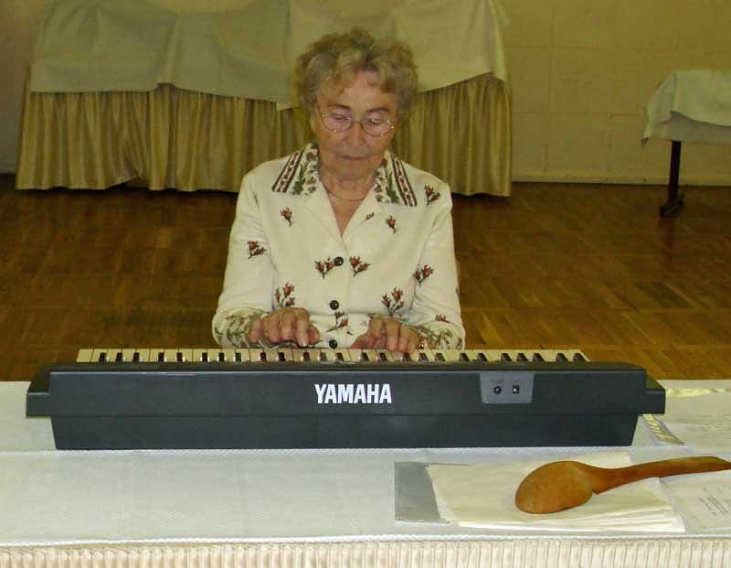 Erika Schirmer ist eine sehr vielseitige Künstlerin und mehrfache Kunstpreisträgerin. Unserer älteren Generation, die in der DDR zur Schule gegangen ist, unter anderem auch bekannt durch das Lied "Kleine weiße Friedenstaube" deren Text und Melodie sie geschrieben hat. Die beiden Frauen boten uns eine gute halbe Stunde ein buntes musikalisches Programm. Frau Schirmer hat auf bekannte Volksliedmelodien neue Texte aufgesetzt rund ums Thema Rezepte, Kochen und das leibliche Wohl.