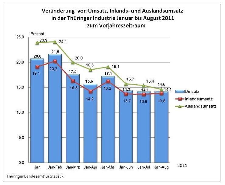 Der Inlandsumsatz wuchs von Januar bis August 2011 zum Vorjahreszeitraum um 13,8 Prozent auf 12,7 Milliarden Euro. Die Auslandsumsätze erhöhten sich von Januar bis August 2011 zum Vorjahreszeitraum um 14,6 Prozent auf 5,9 Milliarden Euro. Betrachtet man die Länder der Eurozone, so stiegen die Exporte Thüringens in den ersten acht Monaten 2011 um 18,2 Prozent auf 3,6 Milliarden Euro. In die Länder der Nicht-Eurozone stiegen die Ausfuhren im Vergleich zum Vorjahreszeitraum um 9,1 Prozent auf 2,2 Milliarden Euro. Die Exportquote betrug im gleichen Zeitraum 31,6 Prozent und war damit um 0,2 Prozentpunkte hö-her als im Vergleichszeitraum 2010.