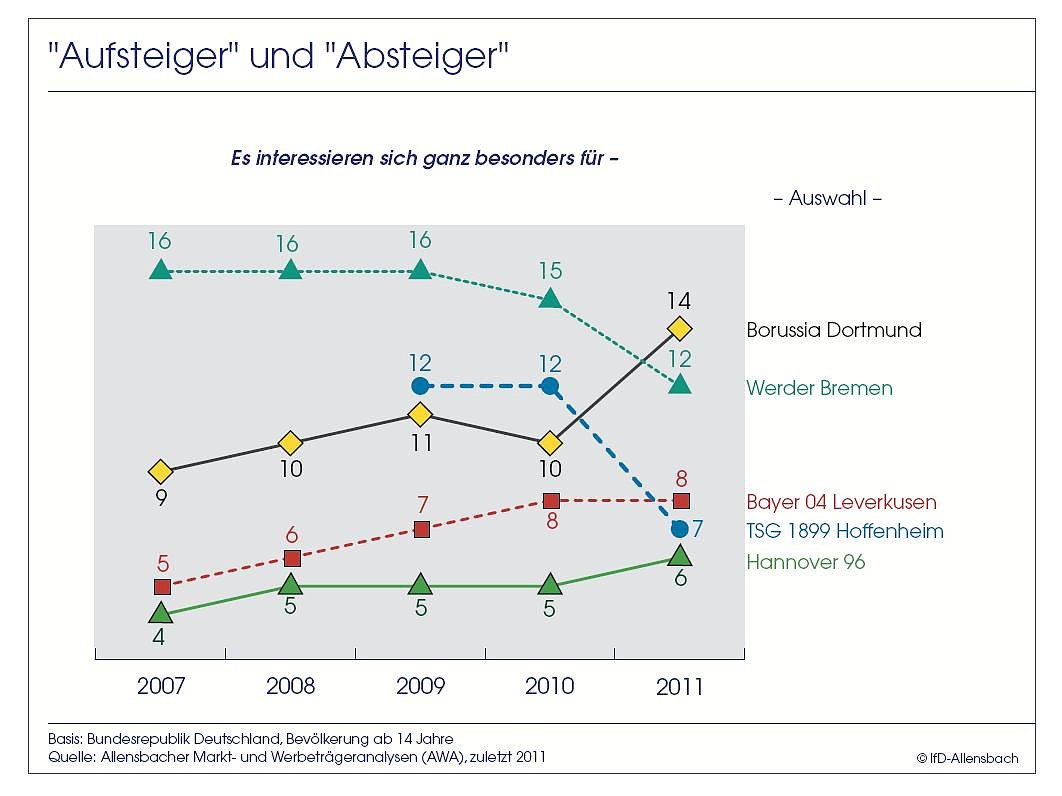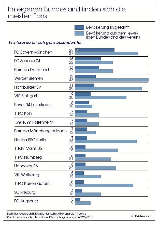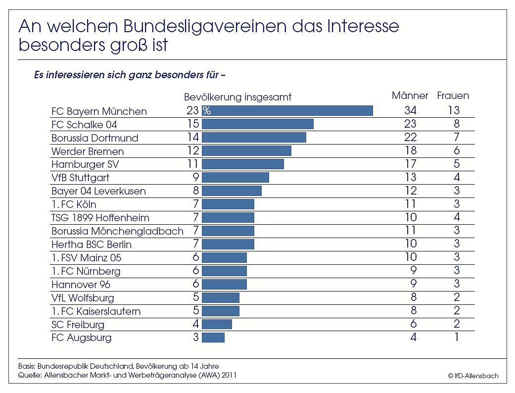Auf Basis der Allensbacher Markt- und Werbeträgeranalyse (AWA) 2011, für die zwischen Frühjahr 2010 und Frühjahr 2011 insgesamt mehr als 20.000 Personen ab 14 Jahre befragt wurden, ergibt sich ein differenziertes Ranking des Interesses an den einzelnen Bundesliga-Vereinen.