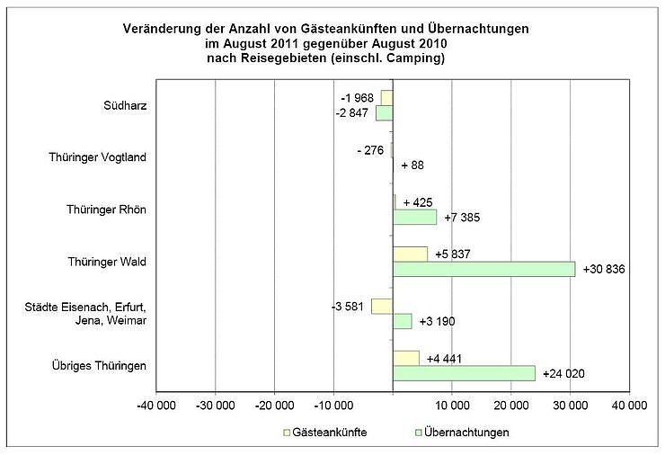 Die Zahl der Gästeankünfte erhöhte sich nach Mitteilung des Thüringer Landesamtes für Statistik gegenüber August 2010 um 1,3 Prozent auf 391.000. Die durchschnittliche Aufenthaltsdauer pro Gast stieg im Vergleich zum Vorjahresmonat von 2,8 auf 2,9 Tage. In Deutschland stieg die Zahl der Übernachtungen nach vorläufigen Ergebnissen des Statistischen Bundesamtes im Vergleich zum entsprechenden Vorjahresmonat um 2,0 Prozent auf 47,6 Millionen.