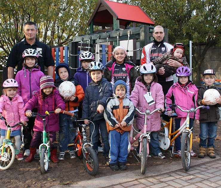 Autor: nnzEnrico Hoffmann vom WSV77 (links im Bild) und Sebastian Albert von den Auebikern (rechts im Bild) übergaben Spielsachen, Fußbälle und Fahrradhelme an die kleinen "Pomaiböcke". Die Kinder und die Erzieherinnen bedankten sich herzlich für die Spenden.