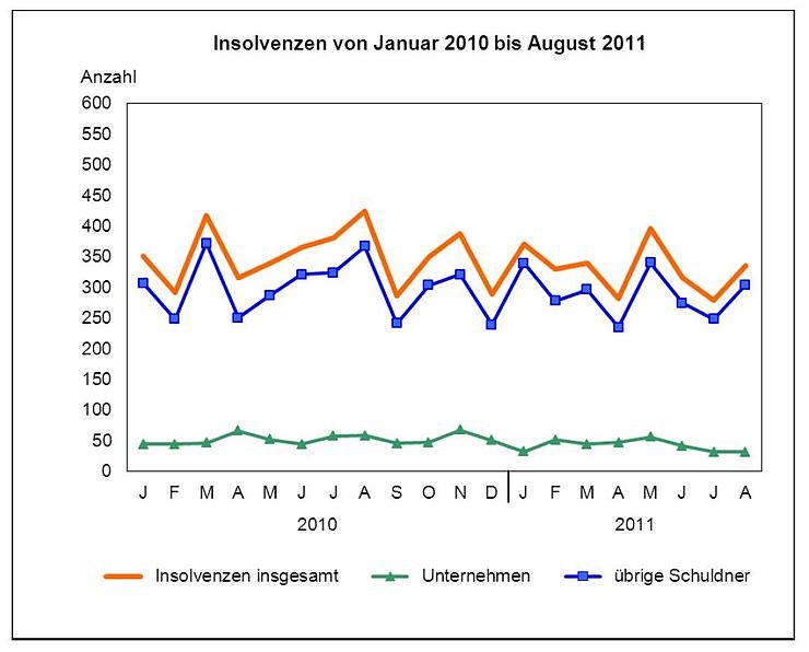 Die Anzahl der Unternehmensinsolvenzen ging im Vergleich der ersten acht Monate 2010 und 2011 um 78 bzw. 19,0 Prozent auf 333 Unternehmen zurück. Die 333 insolventen Unternehmen beschäftigten zum Zeitpunkt des Antrages noch 987 Arbeitnehmer. Der wirtschaftliche Schwerpunkt der Unternehmensinsolvenzen lag mit 86 Verfahren nach wie vor im Baugewerbe, gefolgt vom Bereich Handel; Instandhaltung und Reparatur von Kraftfahrzeugen mit 58 Verfahren.