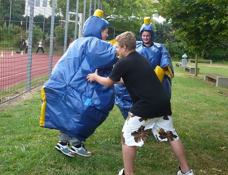 An zwölf verschiedenen Stationen wie zum Beispiel: Bowling, Sumoringen (Archivbild), Gummistiefelzielwurf, Mercedes-Benz-Lauf oder Stelzenlaufen winken den Platzierten Medaillen.