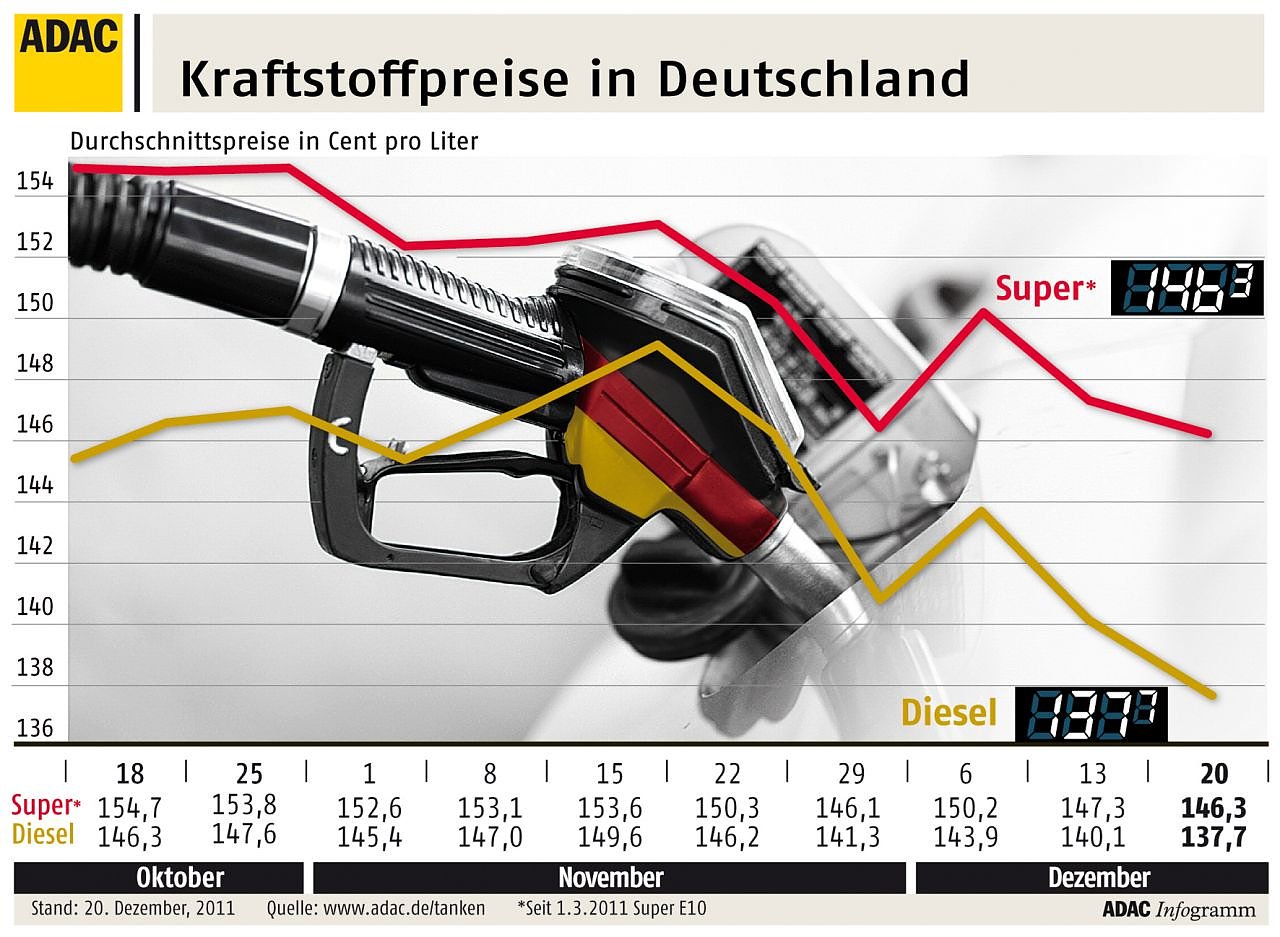 Laut ADAC sind die gesunkenen Kraftstoffpreise unter anderem eine Folge der Preisentwicklung auf dem Rohölmarkt. Ungeachtet dessen sollten die Autofahrer laut ADAC grundsätzlich auf Preisanhebungen vor den Weihnachtsfeiertagen gefasst sein und daher die sich zurzeit bietenden günstigen Gelegenheiten zum Nachtanken nutzen. Preiswerte Tankstellen finden interessierte Autofahrer unter www.adac.de/tanken.