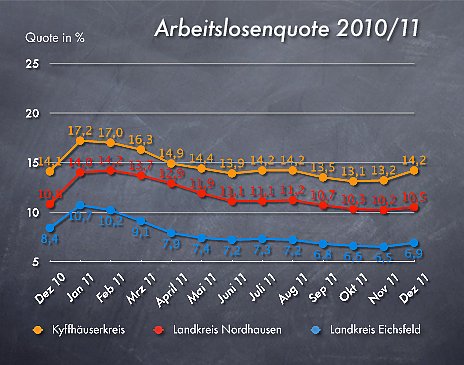 Die Arbeitslosenquote, bezogen auf alle zivilen Erwerbspersonen, betrug zum Jahresende 9,2 Prozent und liegt damit um 0,6 Prozentpunkte niedriger als vor einem Jahr. Der Landkreis Eichsfeld verzeichnete eine Quote von 6,2, der Kyffhäuserkreis von 12,8 und der Landkreis Nordhausen von 9,5 Prozent.