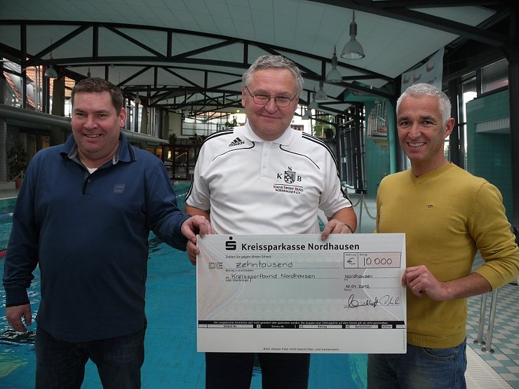 Autor: nnzFrank Kirchhoff (links) und Axel Heck (links), die Organisatoren des "Tags der Legenden" haben am Nachmittag einen Scheck über 10.000 Euro an den Präsidenten des Kreissportbundes Nordhausen, Siegfried Janiszewski, übergeben. Mit der Spende aus dem Erlös des Hallenfußball-Turniers soll die Vorbereitung auf das Seepferdchen finanziell unterstützt werden.