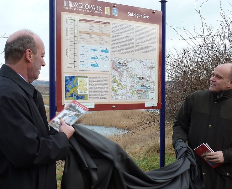 "Hier öffnet sich ein Fenster in die Erdgeschichte", so Landrat Dirk Schatz (rechts) bei der öffentlichen Präsentation der neuen Informationstafel am Salzigen See kurz vor Röblingen am See in Sachsen-Anhalt. Der Salzige See ist vor rund 14.000 Jahren entstanden und wurde 1894 durch die Mansfelder Gewerkschaft endgültig trockengelegt, "weil immer wieder Wasser in die Grubenbaue einbrach", so der Bürgermeister der Gemeinde Seegebiet Mansfelder Land, Jürgen Ludwig.