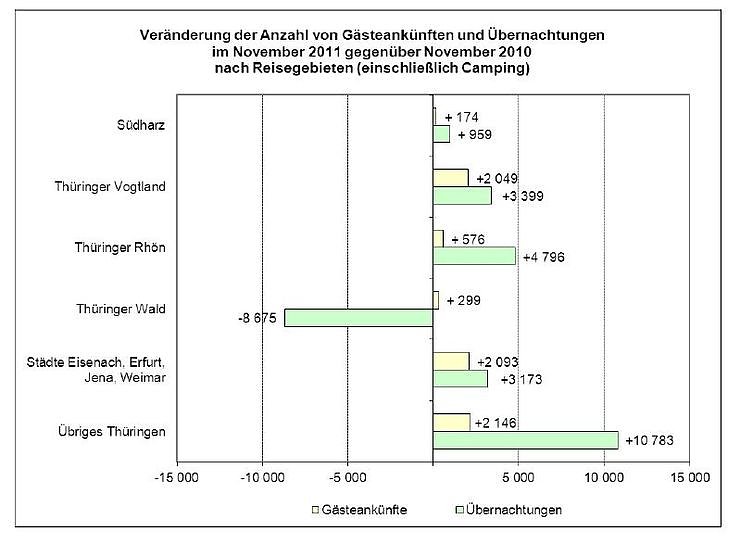 Während die durchschnittliche Aufenthaltsdauer für Thüringen um 0,6 Prozent zurückging, war für den Thüringer Wald ein Rückgang von 3,8 Prozent zu beobachten. Dies war zwar für den Thüringer Wald nur ein Rückgang der durchschnittlichen Aufenthaltsdauer um 0,1 Tage, dennoch wird die gegenläufige Entwicklung der Gäste- und Übernachtungszahlen hier besonders deutlich. So stieg im Thüringer Wald im Vergleich zum November 2010 zwar die Zahl der Gästeankünfte leicht an (+0,4 Prozent), die Zahl der Übernachtungen verringerte sich hingegen merklich (-3,5 Prozent).