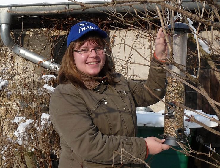 Um jetzt in der kalten Jahreszeit den Vögeln zu helfen, hat der NABU Thüringen eigens eine Musterfutterstelle im Garten der Landesgeschäftsstelle in Leutra angelegt. Anne Adler aus Pahren macht gerade beim NABU ein Praktikum und ist für die Betreuung der Futterstelle zuständig. "Zur Zeit schwirren um unser Futtersilo und die Futterblöcke, die wir im Garten aufgehängt haben, kleine Trupps von Kohlmeisen, Blaumeisen und Haussperlingen. Das Auftreten solcher Gruppen von Vögeln ist jetzt im Winter typisch. Bei vielen Vögeln nimmt das Territorialverhalten ab, die Tiere tolerieren sich untereinander und gehen gemeinsam auf Nahrungssuche", beschreibt die NABU-Praktikantin, die in Eberswalde Landschaftsnutzung und Naturschutz studiert.