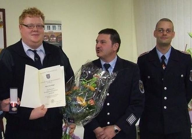Lars Elliger und Ron Friedrich wurden für ihre 10jährige aktive Dienstzeit in der Feuerwehr mit der bronzenen Brandschutzmedaille des Freistaates Thüringen ausgezeichnet.