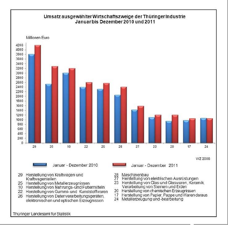 Im Jahr 2011 erzielten die Thüringer Industriebetriebe mit 50 und mehr Beschäftigten einen neuen Spitzenwert von 28,2 Milliarden Euro. Nach Mitteilung des Thüringer Landesamtes für Statistik gab es gegenüber 2010 eine Umsatzsteigerung, bei drei Arbeitstagen weniger, um 2,8 Milliarden Euro bzw. 11,0 Prozent. Und der Spitzenreiter ist?