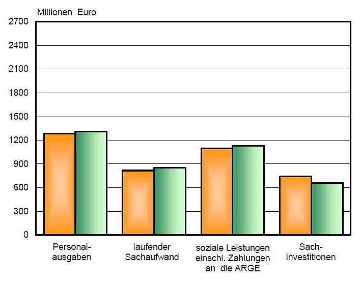 Hauptgründe für diese Entwicklung waren u. a. gewachsene Ausgaben für den laufenden Sachauf-wand, höhere Ausgaben für soziale Leistungen und gestiegene Personalausgaben. Für den laufenden Sachaufwand wurden im Jahr 2011 insgesamt 850,3 Millionen Euro ausgegeben und damit 32,7 Millionen Euro mehr als im Jahr zuvor. Dieser Anstieg resultierte vor allem aus höheren Ausgaben für die Unterhaltung und Bewirtschaftung der Grundstücke und baulichen Anlagen sowie des sonstigen unbeweglichen Vermögens, aus höheren Mieten und Pachten und aus höheren Ausgaben für die Haltung von Fahrzeugen.