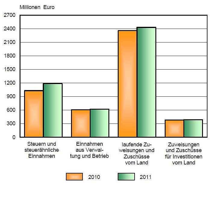 Hauptgründe hierfür waren die Mehreinnahmen aus der Gewerbesteuer (netto) in Höhe von 76,9 Millionen Euro und aus dem Gemeindeanteil an der Einkommensteuer in Höhe von 50,1 Millionen Euro. Den größten Anteil der Einnahmen bildeten im Jahr 2011 die laufenden und investiven Finanzzuwei-sungen vom Land mit einem Volumen von 2,82 Milliarden Euro, das entsprach 57,0 Prozent der Ge-samteinnahmen. Die Zuweisungen für Investitionen vom Land betrugen 387,2 Millionen Euro, 7,3 Millionen Euro mehr als im Jahr 2010.