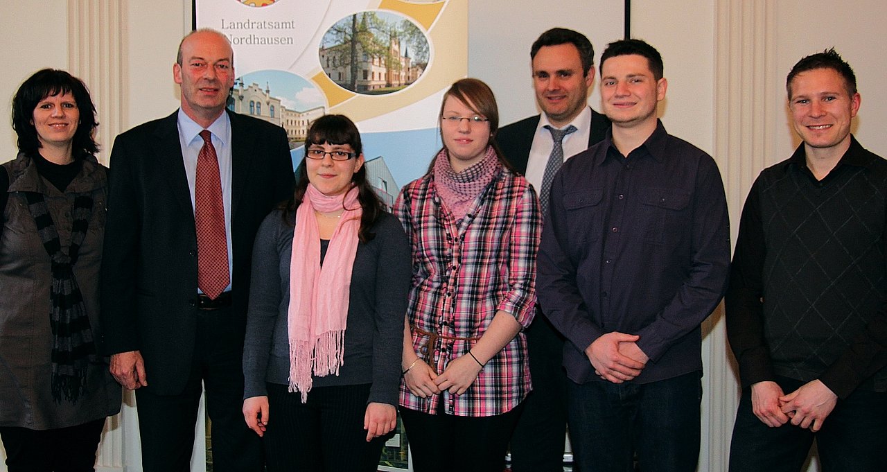 Die 16jährige Julia Hagenbruch aus Sondershausen, der 21jährige Christoph Steiner aus Uthleben und der 29jährige Christoph Kauk aus Jützenbach im Eichsfeld beginnen eine Ausbildung zum Verwaltungsfachangestellten. Silvana Lausch aus Niedersachswerfen, die zurzeit ein Einstiegsqualifizierungspraktikum im Landratsamt macht, fängt eine Lehre zur Kauffrau für Bürokommunikation an.