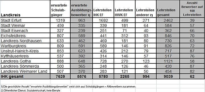 Seit nunmehr zwei Jahren kann die Thüringer Wirtschaft nicht mehr alle offenen Lehrstellen mit geeigneten Bewerbern besetzen, sagt IHK-Hauptgeschäftsführer Gerald Grusser. Die Erfurter Kammer rechne für ihren Bezirk (Nord- und Mittelthüringen) im Jahr 2012 mit rund 5.500 Ausbildungsplatzbewerbern auf etwa 9.000 angebotene Lehrstellen in Industrie und Handel, Handwerk, dem öffentlichen Dienst, der Sozialwirtschaft und den freien Berufen.